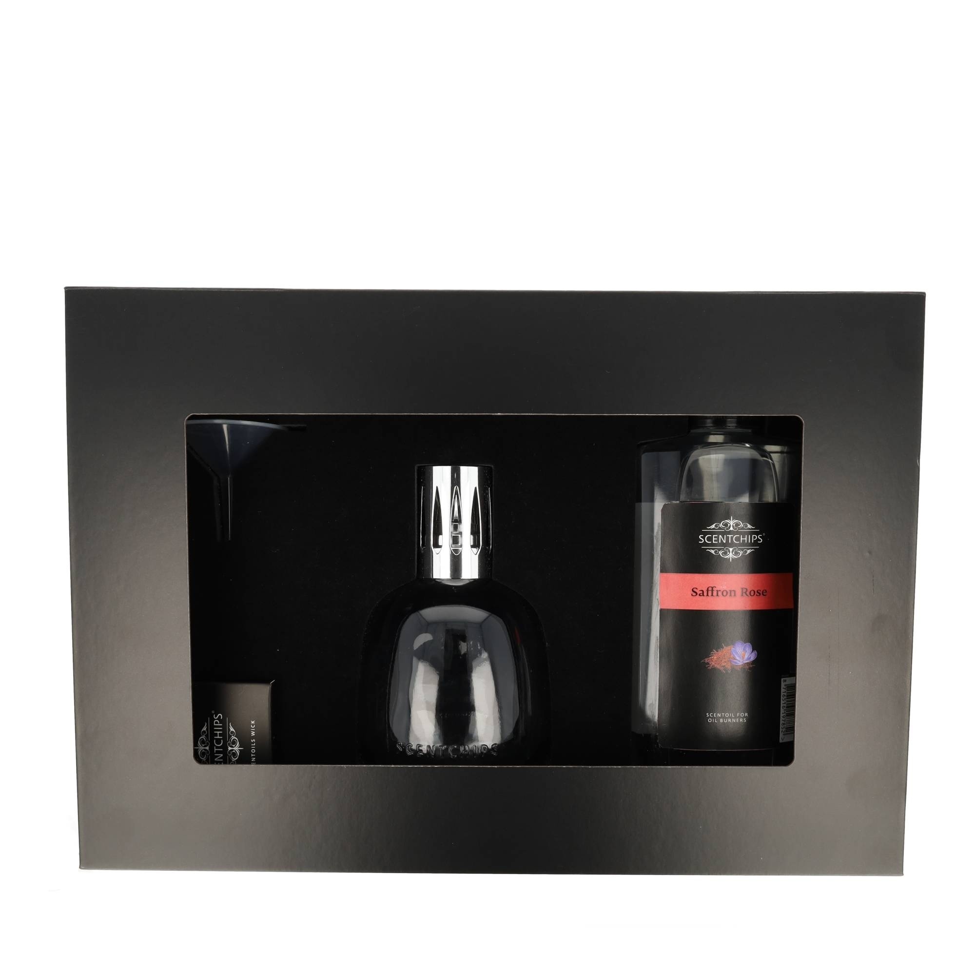Deze luxe cadeauset bevat een zachtgrijze oliebrander, een katalytische lont, een trechter en een huisparfum in de geur Saffron Rose.